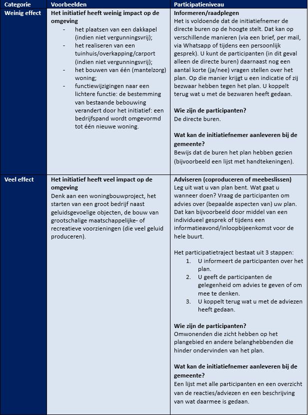 De wetgever heeft niet bepaald wanneer sprake is van (on)voldoende participatie. Dat is lastig, aangezien het in eerste instantie aan het college2 is om te beoordelen of de initiatiefnemer in redelijkheid heeft kunnen volstaan met de verrichte participatie. Daarom hanteren wij het volgende uitgangspunt: "Des te meer invloed een plan heeft op de fysieke leefomgeving, des te hoger het participatieniveau moet zijn." De mate van participatie moet in verhouding staan tot het effect dat het plan op de omgeving heeft. Een initiatiefnemer moet zich afvragen hoeveel invloed zijn plan heeft op de omgeving en wie er iets gaan merken.