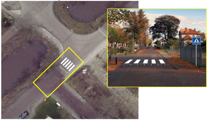 Een duidelijke voetgangersoversteekplaats (zebrapad) vermindert conflictkansen en sluit aan bij de principes van Duurzaam Veilig (CROW).