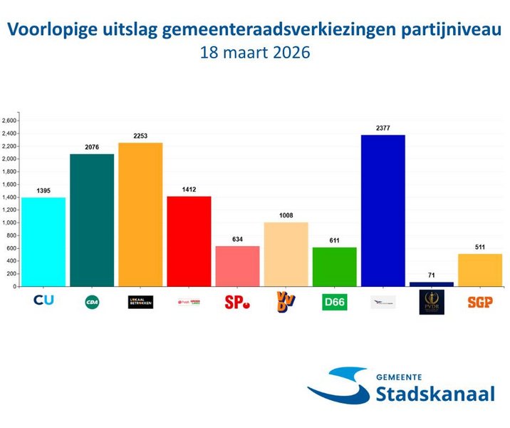 Op deze pagina vindt u de voorlopige uitkomsten van de Gemeenteraadsverkiezing van 18 maart 2026 in de gemeente Stadskanaal. Voor de zitting van het gemeentelijk stembureau (GSB) op 19 maart zijn alle stemmen gecontroleerd en geteld per kandidaat met de voorlopige uitslag als resultaat. De definitieve uitslag met de zetelverdeling wordt bekendgemaakt door het centraal stembureau op donderdag 26 maart om 10:00 uur.